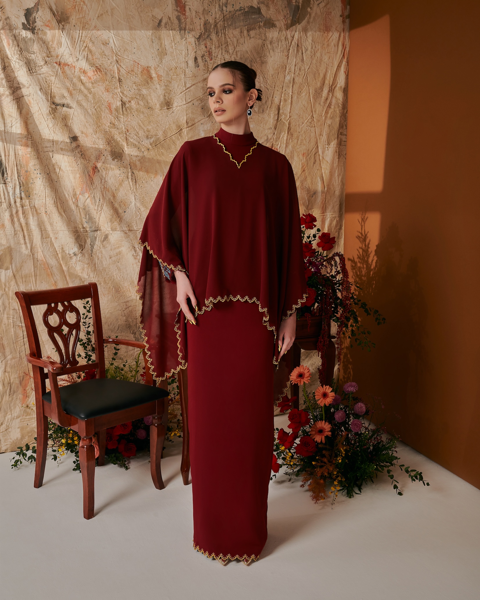 Scalloped v-neck Kurung modern with chiffon draping.